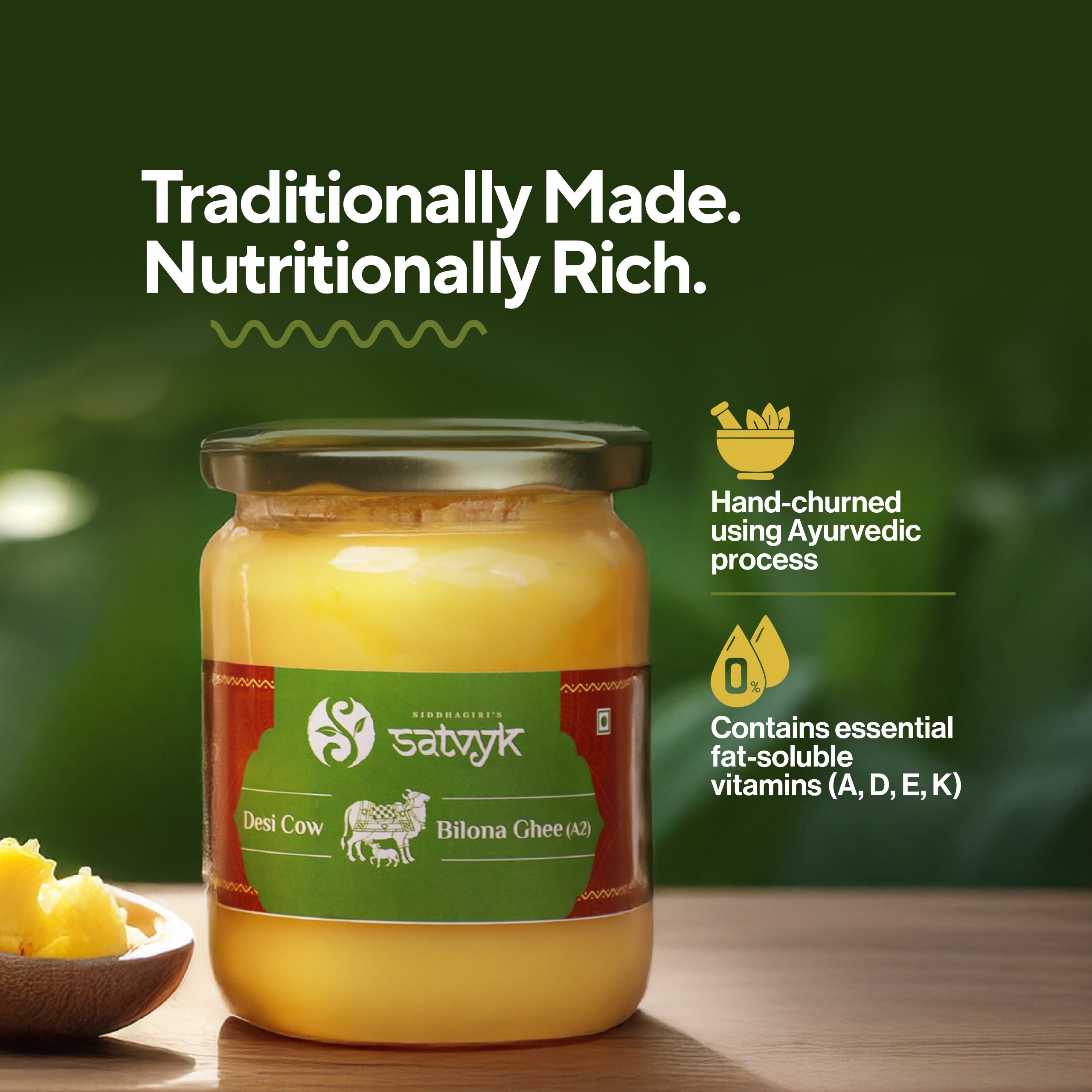 A2 Desi Gir Cow Ghee, the golden elixir of Ayurveda is prepared using age-old Vedic method, also known as ‘Bilona’. Our Ancestors used to prepare Bilona Ghee at home through a painstaking process which left behind pure golden ghee with a rich aroma. Satvyk’s Desi Gir Cow Ghee is made using this ancestral Vedic recipe. Farm fresh Milk of indigenous Desi Gir Cow breeds is used in the preparation which contains A2 beta-casein protein and thus, the Ghee is popularly known as A2 Organic Ghee.