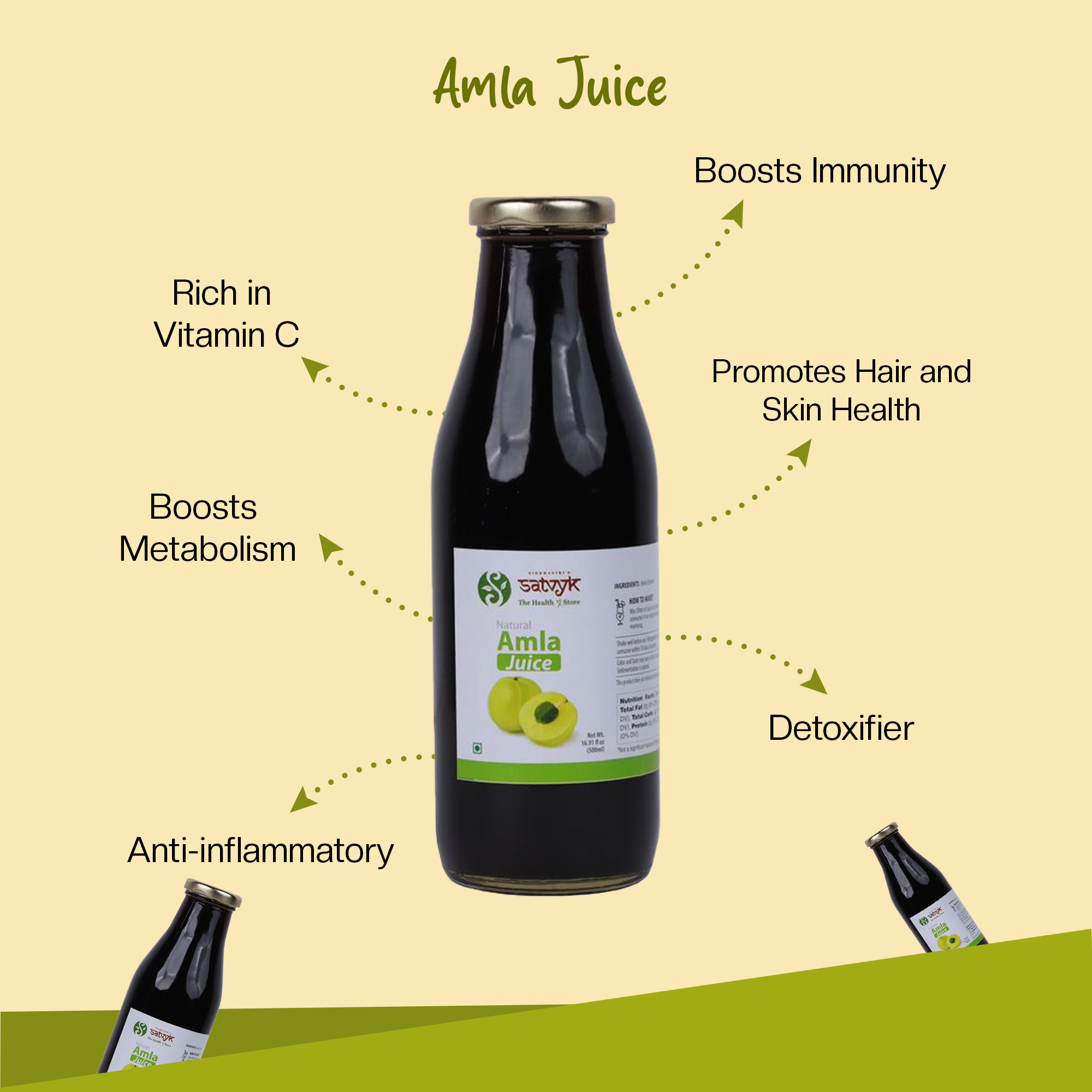 Satvyk's Organic Amla Juice is a powerhouse of nutrition, packed with the goodness of fresh, handpicked amla (Indian gooseberry). We use cold-press technique to retain maximum nutrients and purity. This juice is a natural source of vitamin C, antioxidants, and essential minerals.Free from additives and preservatives, organic cold-pressed amla juice is a pure and natural way to incorporate wellness into your daily routine. Enjoy it diluted with water or as a refreshing morning tonic to start your day on a healthy note.