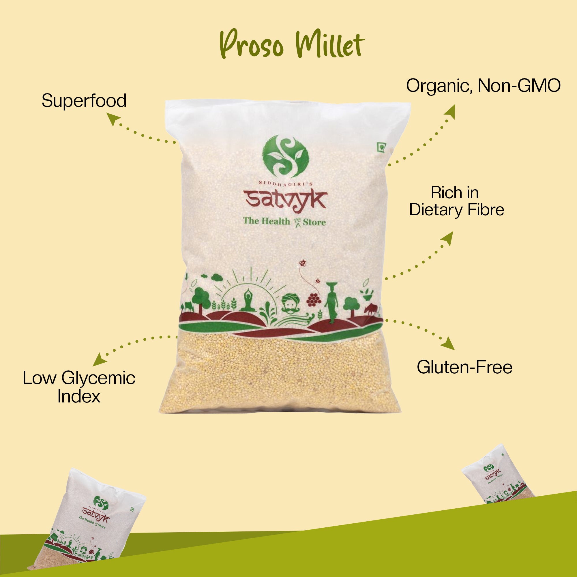 Satvyk’s Organic Proso Millet is a highly nutritious and versatile grain, grown organically without any chemicals or pesticides. Known for its mild flavor and easy digestibility, Proso Millet is a rich source of fiber, protein, iron, and essential vitamins, making it an excellent addition to a balanced diet. It is naturally gluten-free and has a low glycemic index, making it suitable for those with gluten sensitivities or managing blood sugar levels. With its numerous health benefits and natural purity, Satvyk’s Organic Proso Millet offers a wholesome, chemical-free option for your daily meals.